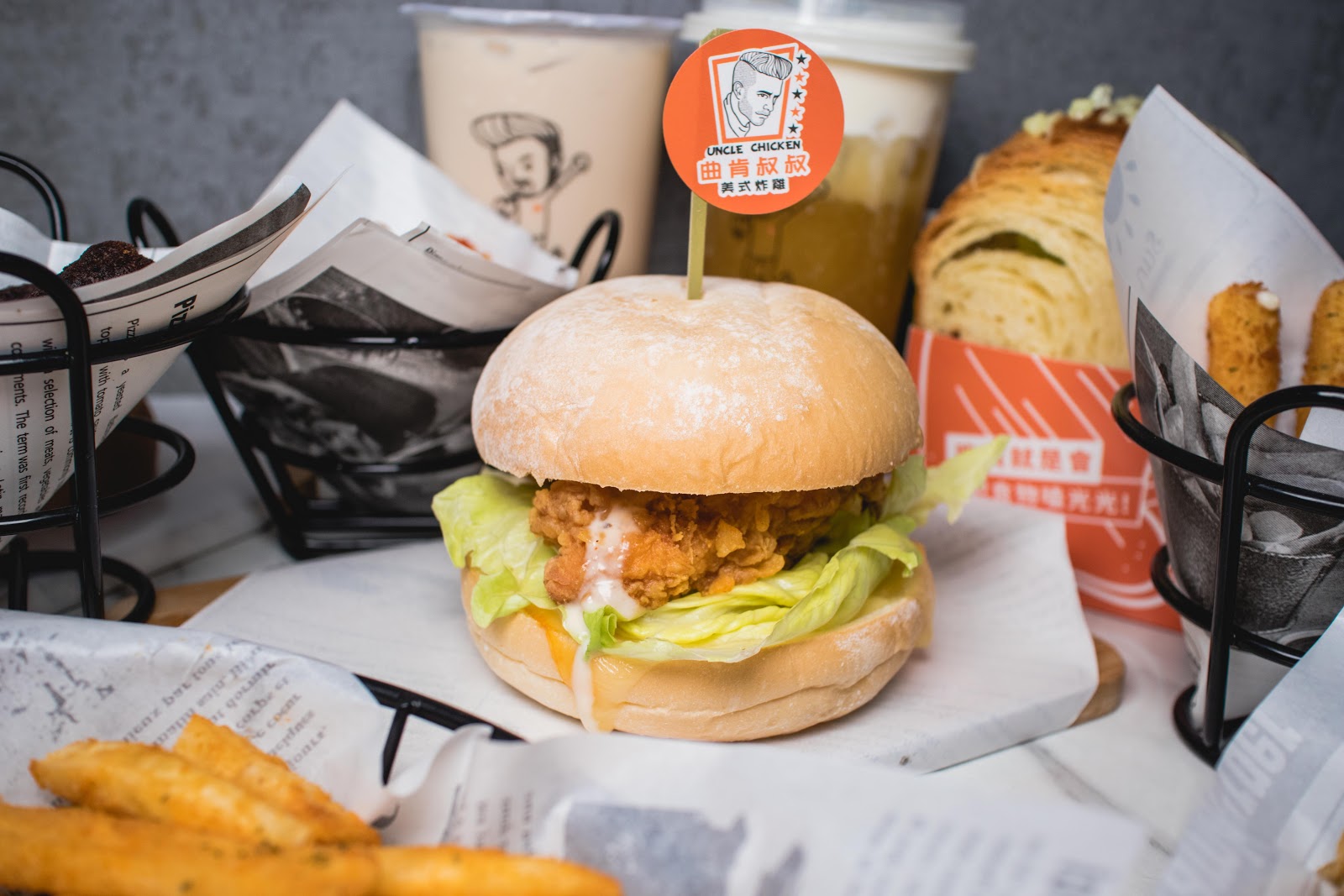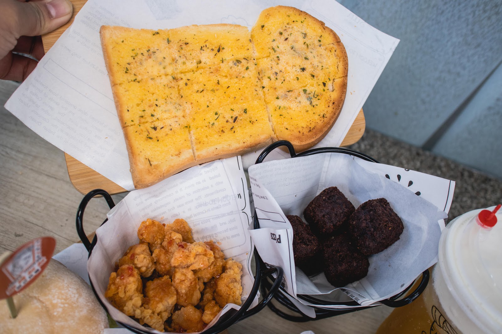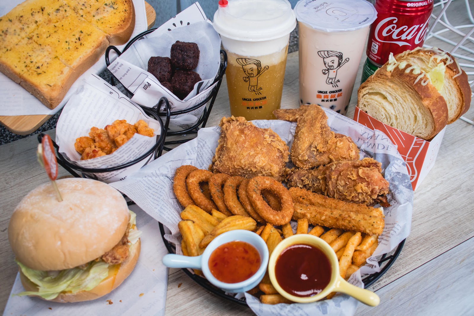 我們點了四號餐(雞翅+雞塊+雞腿)、三號餐(雞米花+麥克雞塊+小薯條)、無骨雞腿堡(原味/泰式)、厚牛滿分三明治、洋蔥圈、起司乳酪條、香蒜厚片、炸布朗尼、珍珠奶茶、厚奶蓋青茶。